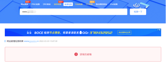 2:借助網(wǎng)站檢測(cè)工具進(jìn)行檢測(cè),boce.com撥測(cè)網(wǎng)站檢測(cè)算是比較齊全的檢查工具,通過(guò)選擇被墻檢測(cè),輸入域名就可以檢測(cè)出結(jié)果。