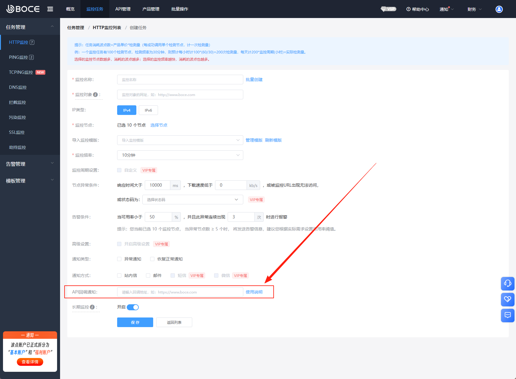 1、 監(jiān)控任務(wù)新增自定義API回調(diào)通知:可設(shè)置API回調(diào)通知的地址,當(dāng)監(jiān)控任務(wù)出現(xiàn)告警時(shí)將會(huì)向設(shè)置的地址發(fā)送數(shù)據(jù)。