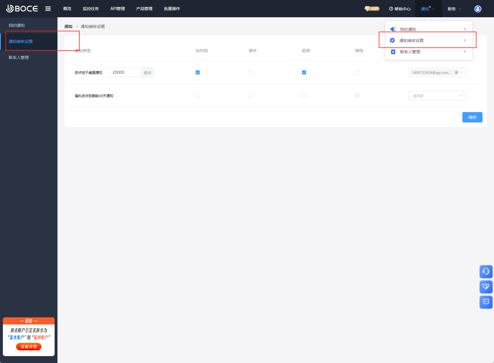 3、 新增通知接收設(shè)置:可設(shè)置各通知功能的接收方式與聯(lián)系人,任務(wù)通知需在任務(wù)編輯中設(shè)置。