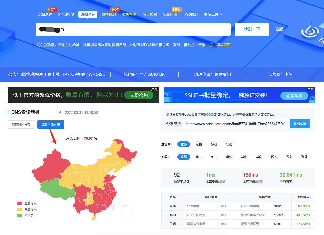 此外撥測(cè)平臺(tái)的【DNS查詢(xún)】工具還可查看網(wǎng)站域名更詳細(xì)的DNS污染分布數(shù)據(jù),查看網(wǎng)站在全國(guó)的污染分布情況以及污染比例。