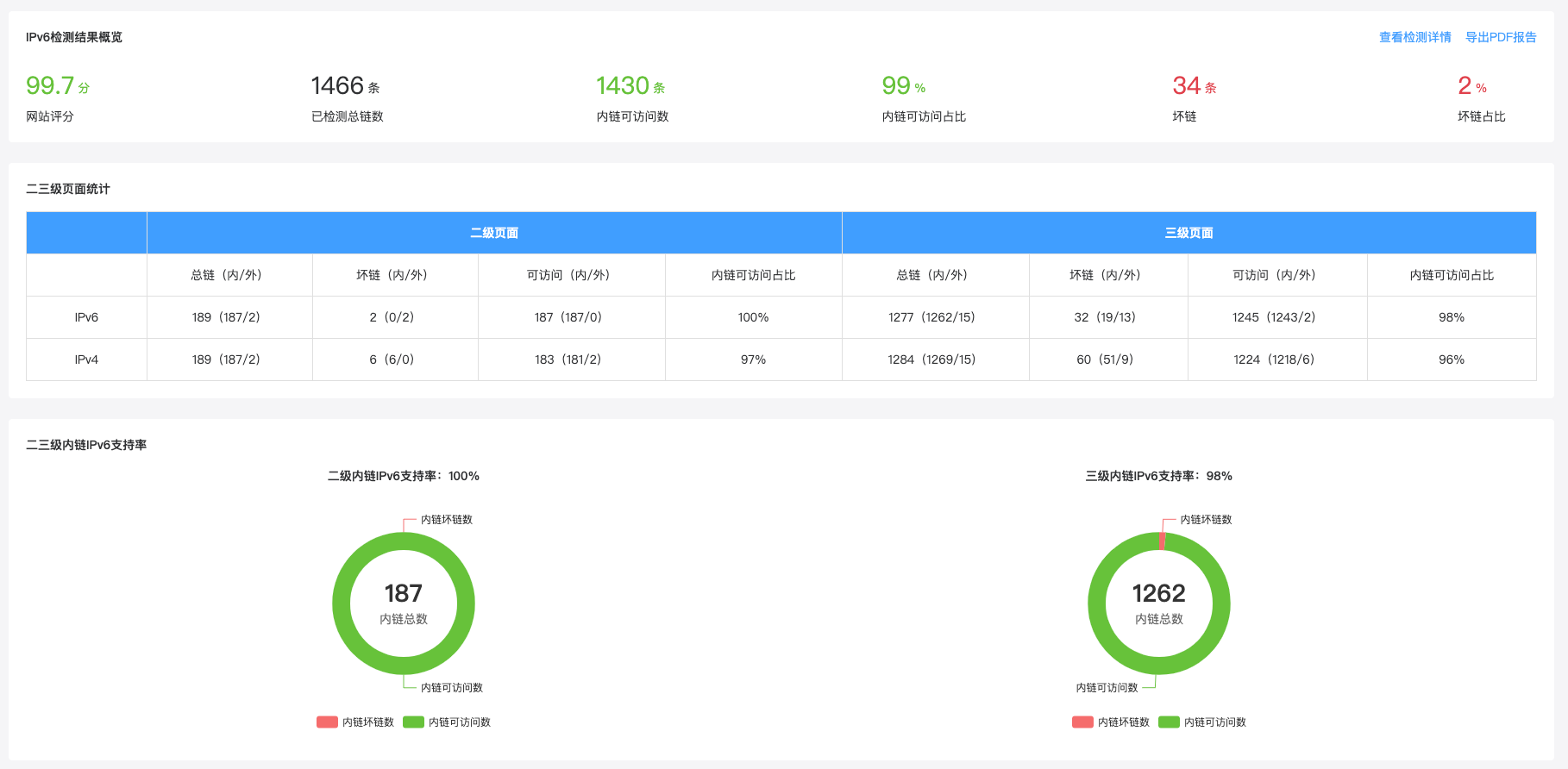 可選擇使用撥測平臺的IPv6支持度檢測服務(wù),該服務(wù)能夠通過檢測輸出IPv6檢測報告,包括網(wǎng)站IPv6檢測評分,網(wǎng)站二、三級鏈接IPv6支持率,網(wǎng)站壞鏈情況,網(wǎng)站IPv6檢測快照詳情等,能夠幫助您快速定位風(fēng)險,助力企業(yè)完成網(wǎng)站IPv6改造升級!
